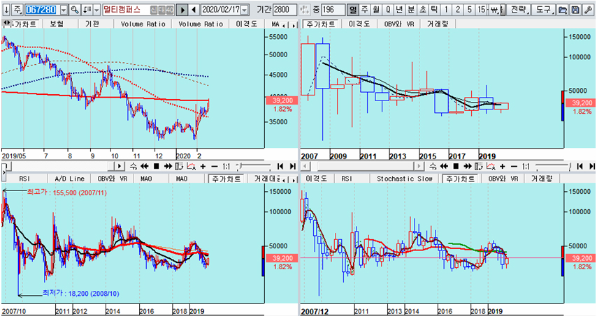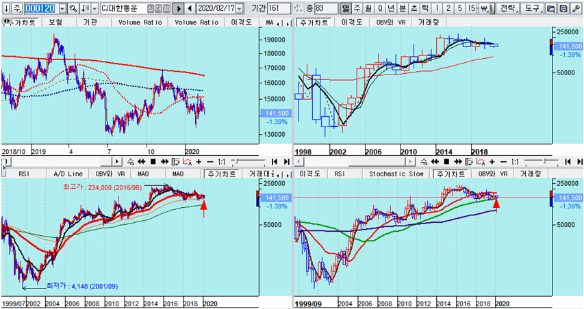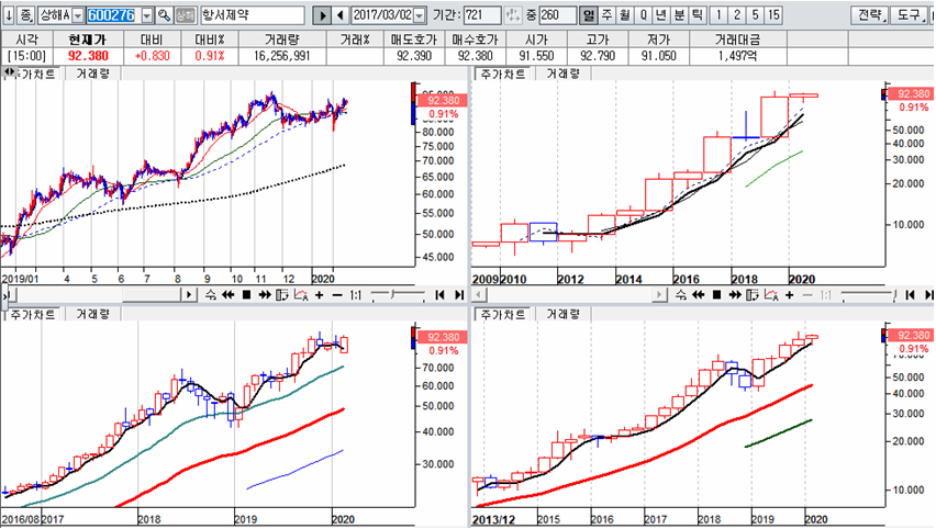 지금 시점에서 주가를 보면 월, 분기, 간 차트 모두