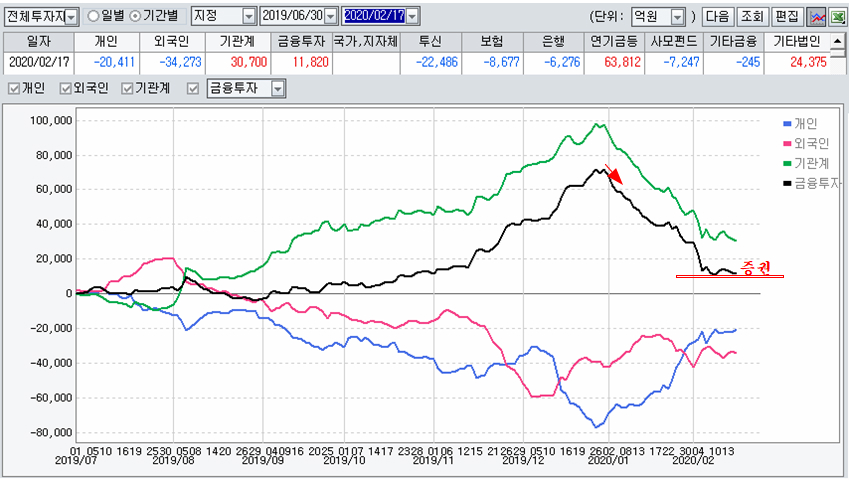 연초 기관의 매도 물량 때문에 상승이 억제되고 하락이 이어졌지만,